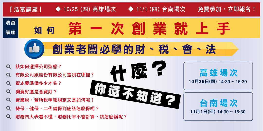 別擔心!浩富為您精心準備了創業懶人包: 『創業老闆必學的財、稅、會、法』